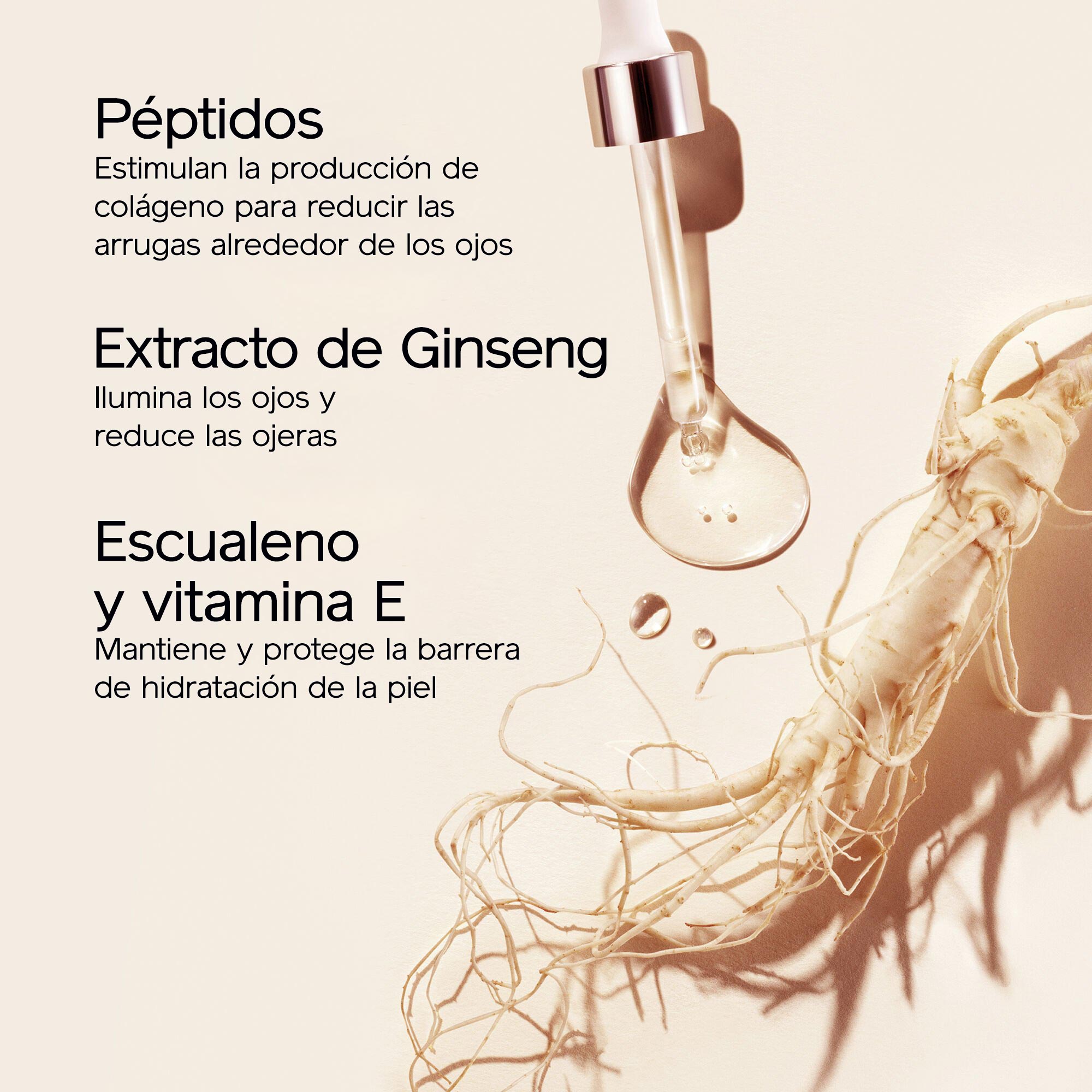 - Extracto de Ginseng: ilumina los ojos y reduce las ojeras.