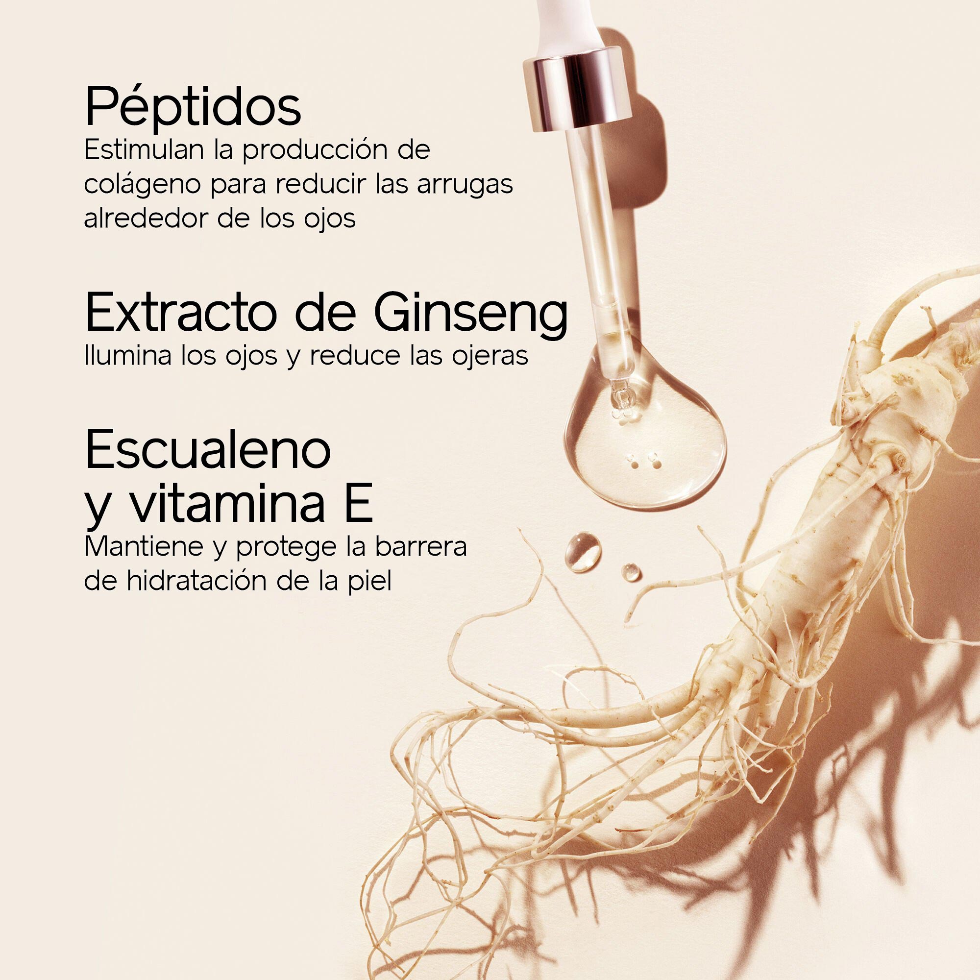 - Extracto de Ginseng: ilumina los ojos y reduce las ojeras.