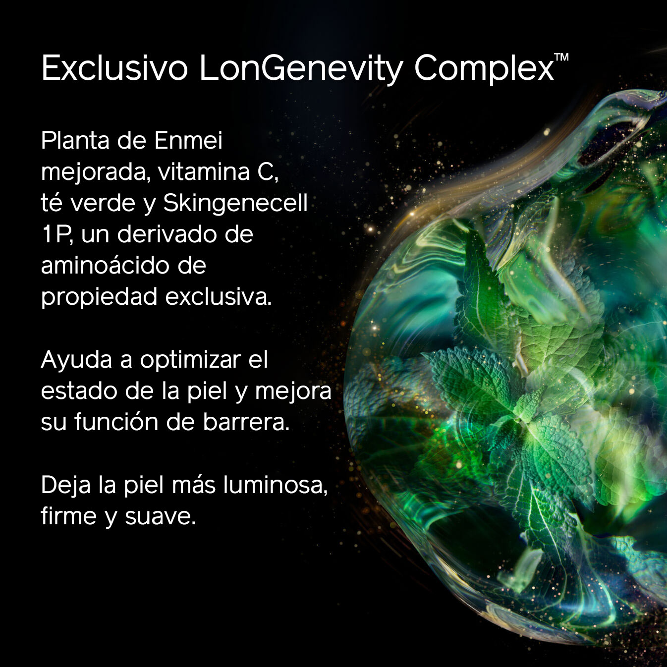 - Exclusivo LonGenevity Complex™: compuesto por la planta de Enmei recién mejorada, vitamina C, té verde y Skingenecell 1P, un derivado de aminoácidos de propiedad exclusiva, ayuda a optimizar la condición de la piel a cualquier edad. Esta poderosa fórmula ayuda a mejorar la función protectora de la piel y deja la piel más iluminada, tersa y suave.