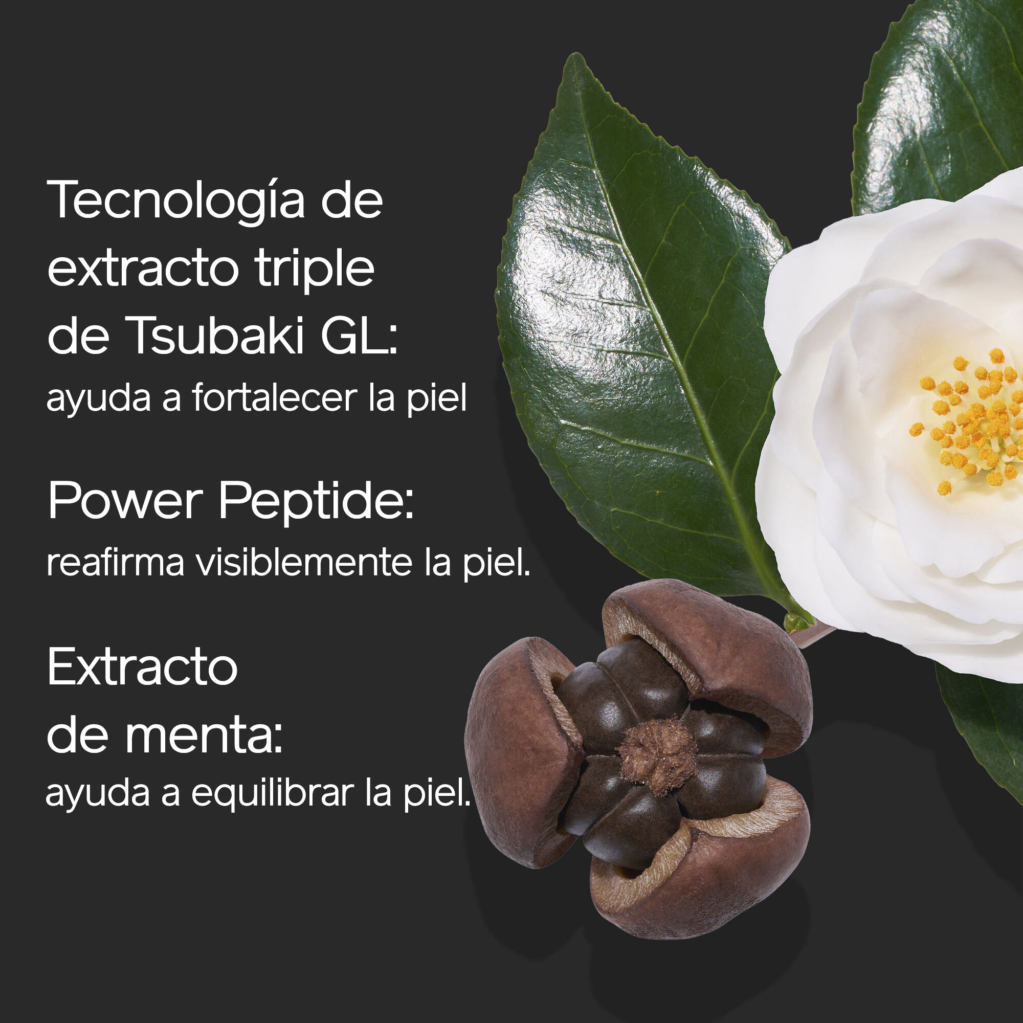 - Tecnología de extracto triple de Tsubaki GL (extractos de flor, semilla y hoja de Tsubaki): ayuda a fortalecer las defensas internas de la piel y combate los signos del envejecimiento.