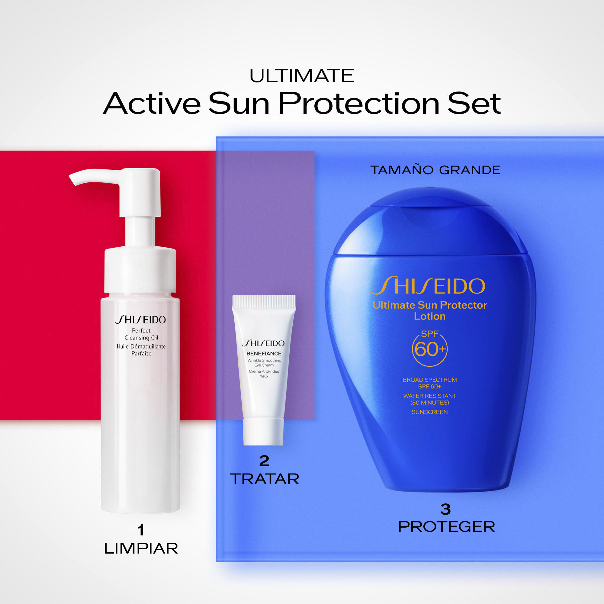 Como primer paso, usa Benefiance Wrinkle Smoothing Eye Cream para tratar la apariencia de las arrugas y las ojeras en el área de los ojos. Aplica Ultimate Sun Protector Lotion SPF 60+ para proteger e hidratar la piel. Por último, disuelve las impurezas más difíciles de eliminar y los residuos de fórmulas resistentes al agua de larga duración y, al mismo tiempo, retiene la humedad de la piel con Perfect Cleansing Oil.