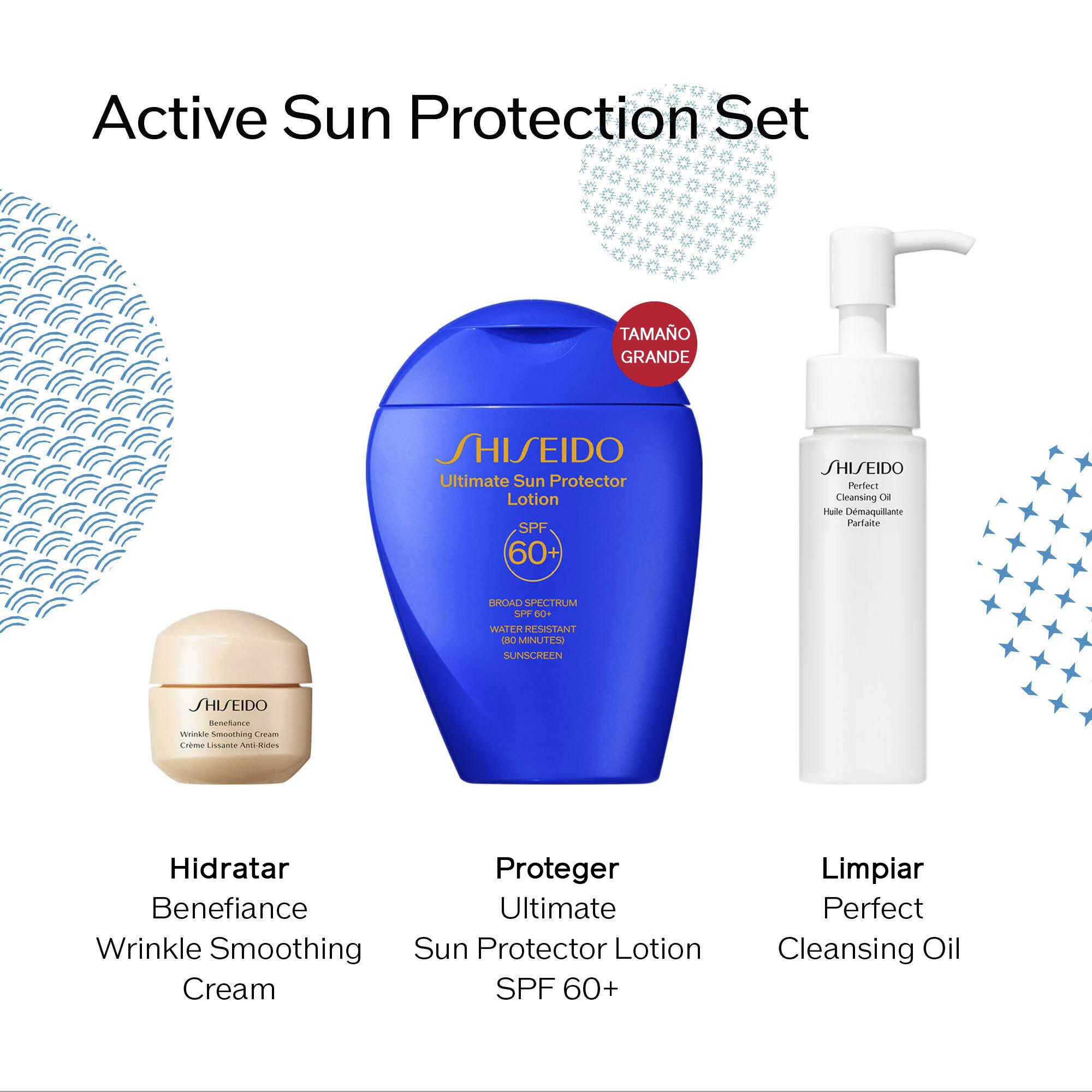 Este set de regalo con protector solar y productos para el tratamiento de la piel protege e hidrata la piel en los días de actividad al aire libre, e incluye una loción Ultimate Sun Protector Lotion SPF 60+ de tamaño normal con un velo protector invisible que se refuerza con el calor y el agua. Este set también incluye muestras del aceite limpiador Perfect Cleansing Oil, ideal para eliminar el filtro solar; y la crema Benefiance Wrinkle Smoothing Cream, para aumentar la suavidad y la hidratación.