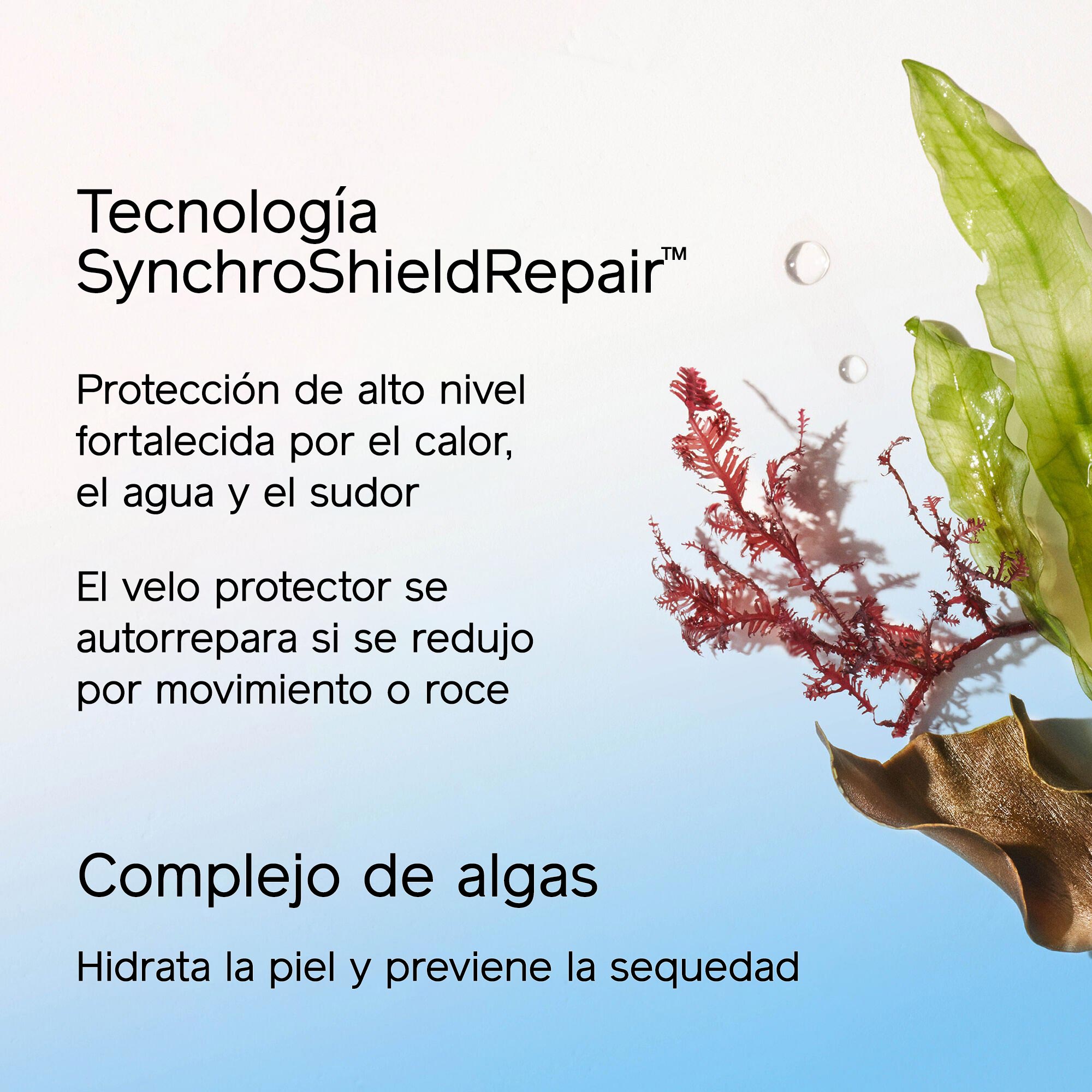 - NUEVA tecnología SynchroShieldRepair™: el velo protector se intensifica en contacto con el calor, el agua y la transpiración, y se autorrepara si el velo se redujo por movimiento o roce.