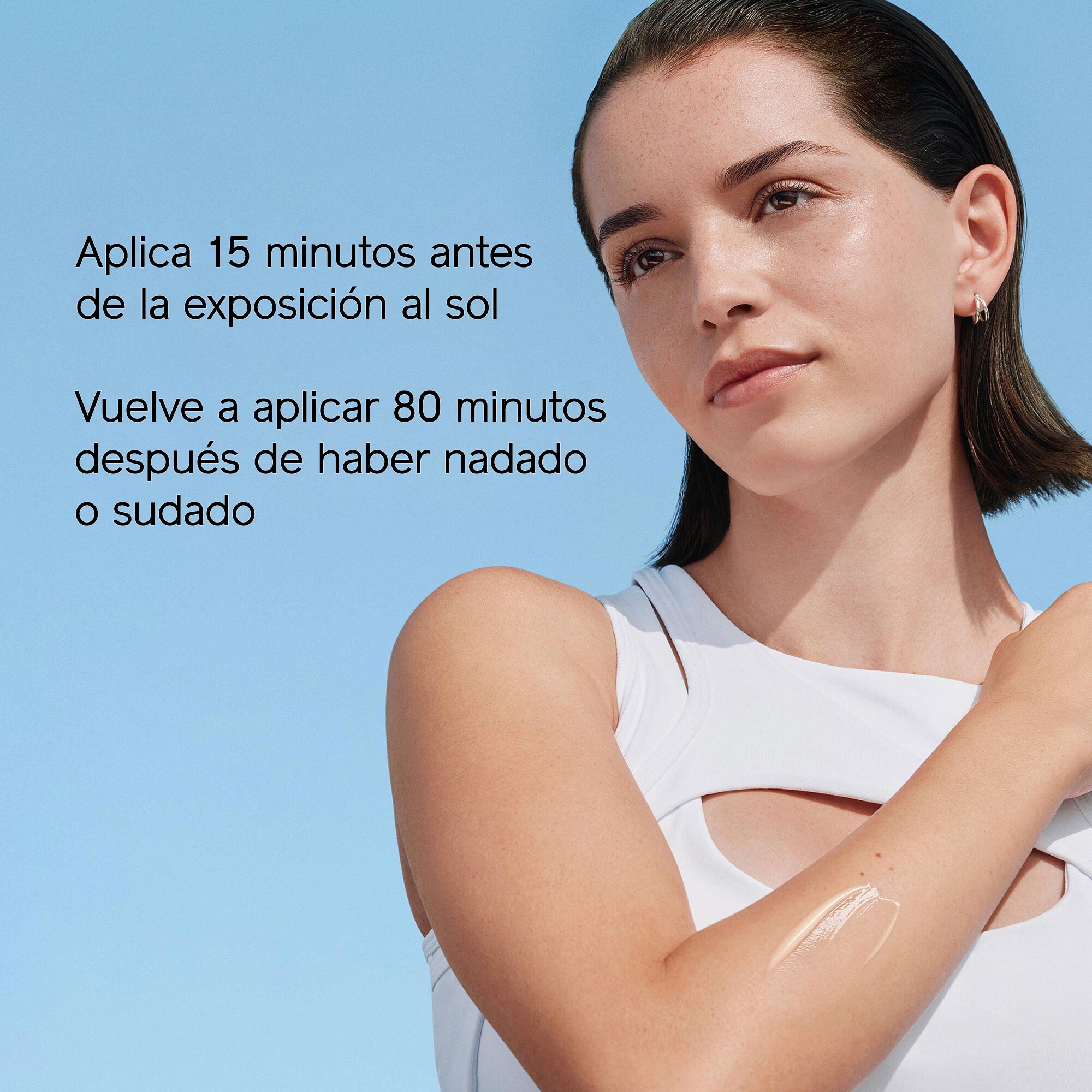 - Vuelve a aplicar 80 minutos después de haber nadado o sudado, inmediatamente después de secarte con una toalla.
