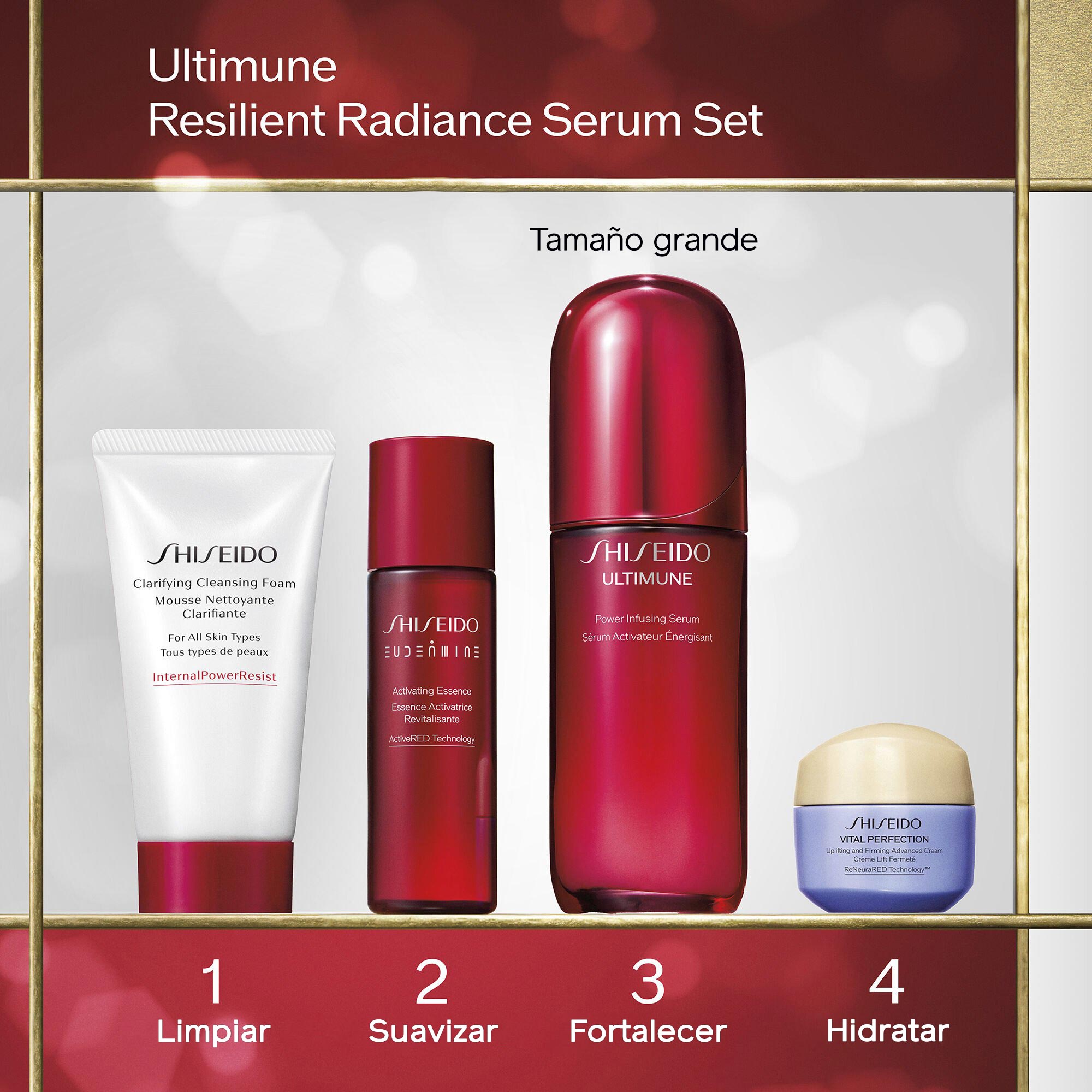 Elimina las impurezas y el maquillaje con la espuma limpiadora Clarifying Cleansing Foam, ilumina y potencia la claridad de tu piel con la esencia Eudermine Activating Essence, combate los signos del envejecimiento, como el tono desigual de la piel, la opacidad y las arrugas, con el suero Ultimune Power Infusing Serum, y disfruta de una piel más firme y luminosa con la crema Vital Perfection Uplifting and Firming Advanced Cream.